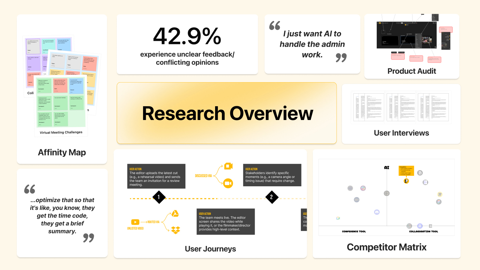 To understand where AI could meaningfully reduce this overhead while respecting the creative process, we conducted a multi-method research approach with 22+ participants, including user interviews, surveys, journey mapping, and competitive analysis.